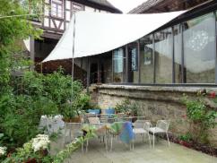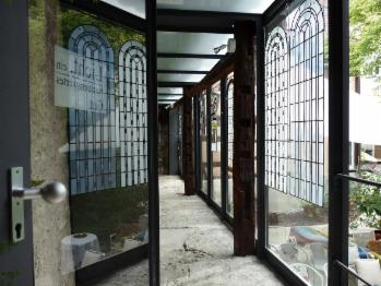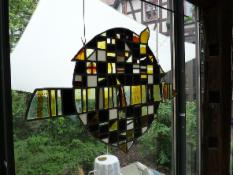 12 Lichtkörper – Leuchträume – von maximal machbarer Größe, um sie durch die Pforte in den Hof zu bringen, bilden wiederum Lichträume, durch die hindurchgegangen werden kann. Sie bilden einen 12 –strahligen Stern nach außen. Gleichzeitig 12 Strahlen nach innen. Zugängliche und unzugängliche Räume entstehen. Ein Einziger dieser Lichtkörper macht schon schön hell. Und wenn alle so nebeneinander stehen, bekommen die elf Anderen von dem Einen etwas mit , sie werden beleuchtet, vielleicht durchleuchtet oder sogar erleuchtet . Aber dann, wenn alle Zwölf leuchten, dann kommt erst das „Strahlen“ auf, das Zusammenstrahlen . Das könnte bildhalft auf uns Alle übertragen werden. Kaum ein Begriff wie „Licht“ – ist so vielschichtig und wird so oft bildhaft verwendet: Wir sollten beispielsweise „unser Licht nicht unter den Scheffel stellen“, oder, wenn ich sage „ mir geht ein Licht auf“, dann habe ich vielleicht urplötzlich eine wichtige Erkenntnis, und sehe dann vielleicht alles in einem „neuen Licht“. Und, um im Bild zu bleiben, die zwölf Lichtkörper könnten auch zwölf lichterfüllte Monate im Neuen Jahr darstellen...Vitrail, Glasfensterkunst